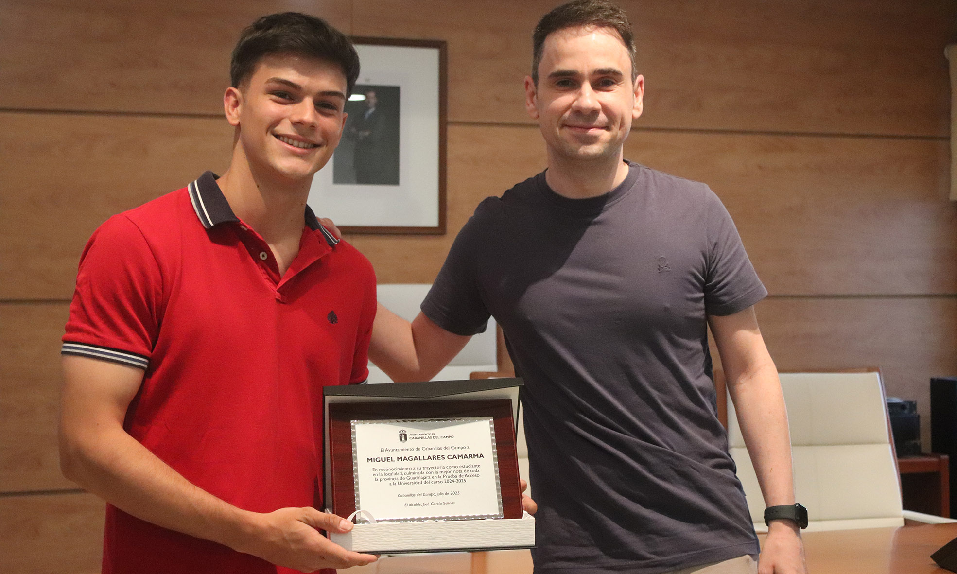 El alcalde entregó una placa conmemorativa al brillante alumno de Cabanillas, que ha obtenido este la nota más alta de la provincia en el acceso a la universidad