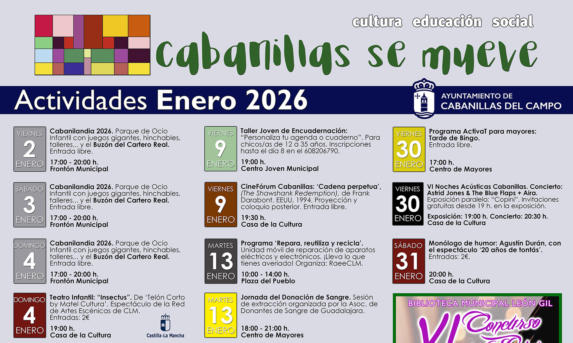 Disponible el cartel mensual con las actividades socioculturales previstas en Cabanillas del Campo en enero de 2026