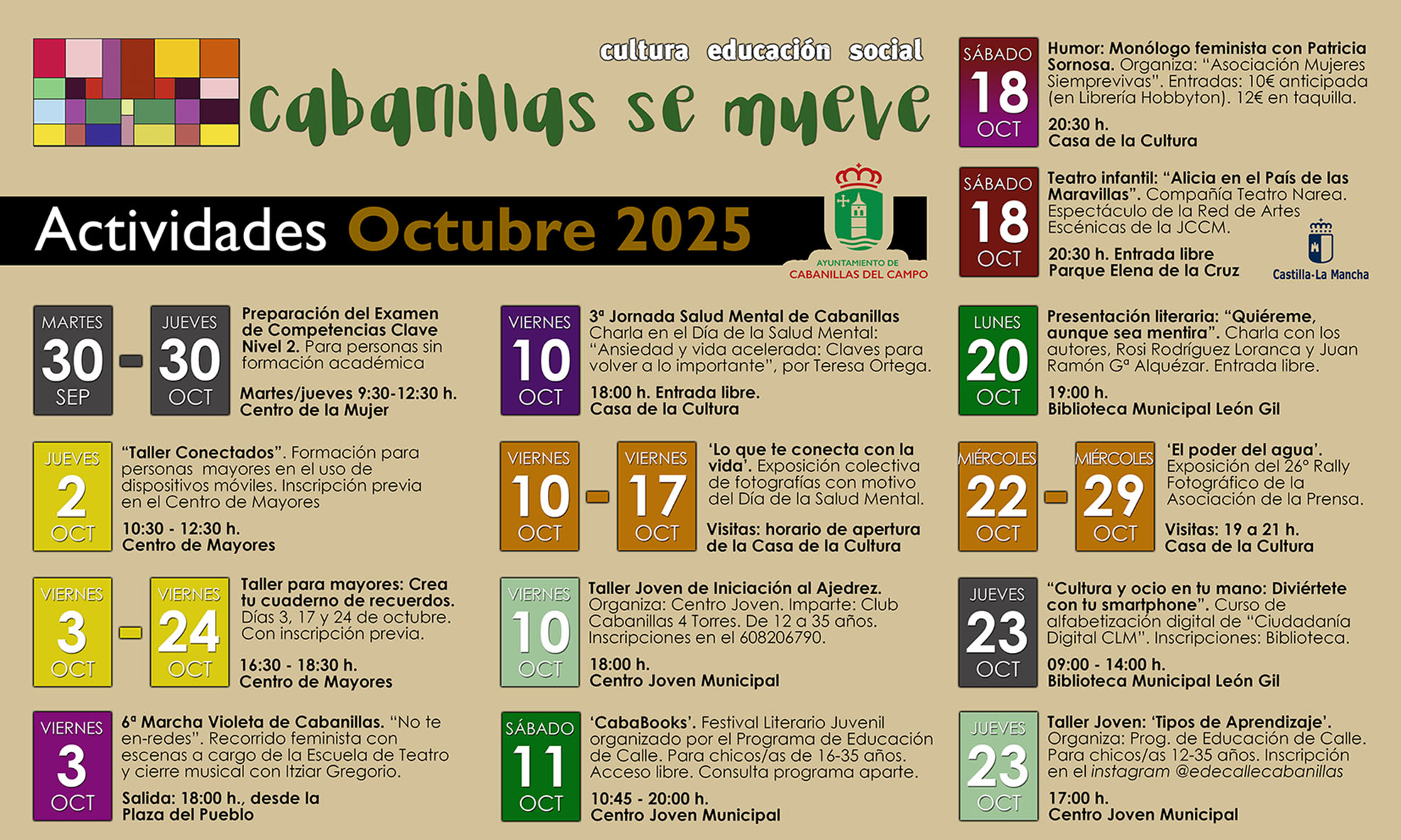 Disponible para consulta y descarga el cartel mensual de actividades socioculturales "Cabanillas se mueve" de octubre de 2025