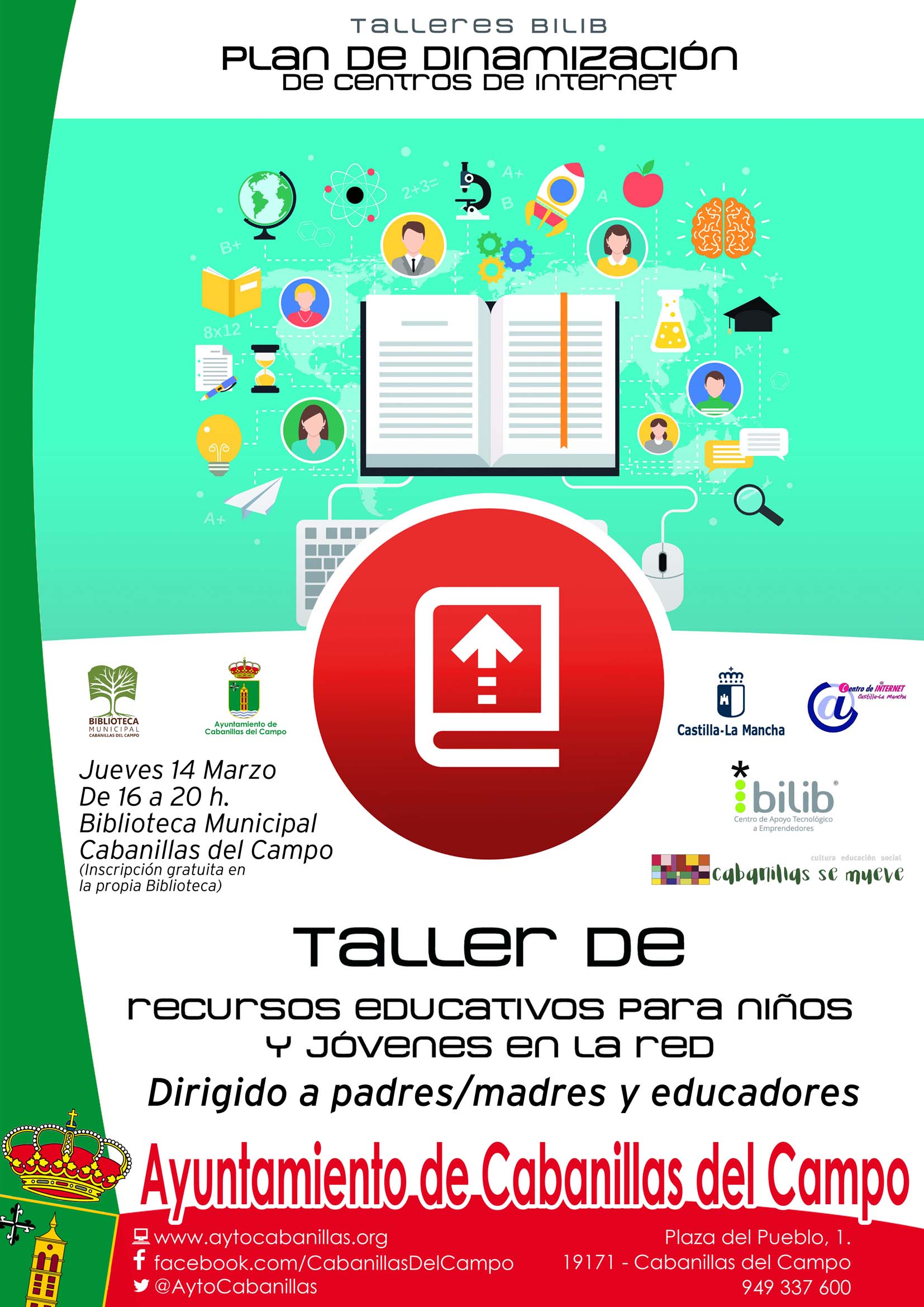 La Biblioteca Municipal de Cabanillas organiza en los próximos días dos nuevos talleres del Bilib, el Centro de Apoyo Tecnológico a Emprendedores de Castilla-La Mancha, ambos destinados a padres, madres y personal docente que trabaje con niños y jóvenes. El primero es sobre «Recursos educativos para niños y jóvenes en la Red», y se impartirá el jueves 14 de marzo; y el segundo será al siguiente jueves, 21 marzo, sobre «Prevención del ciberbullyng o acoso escolar por Internet».