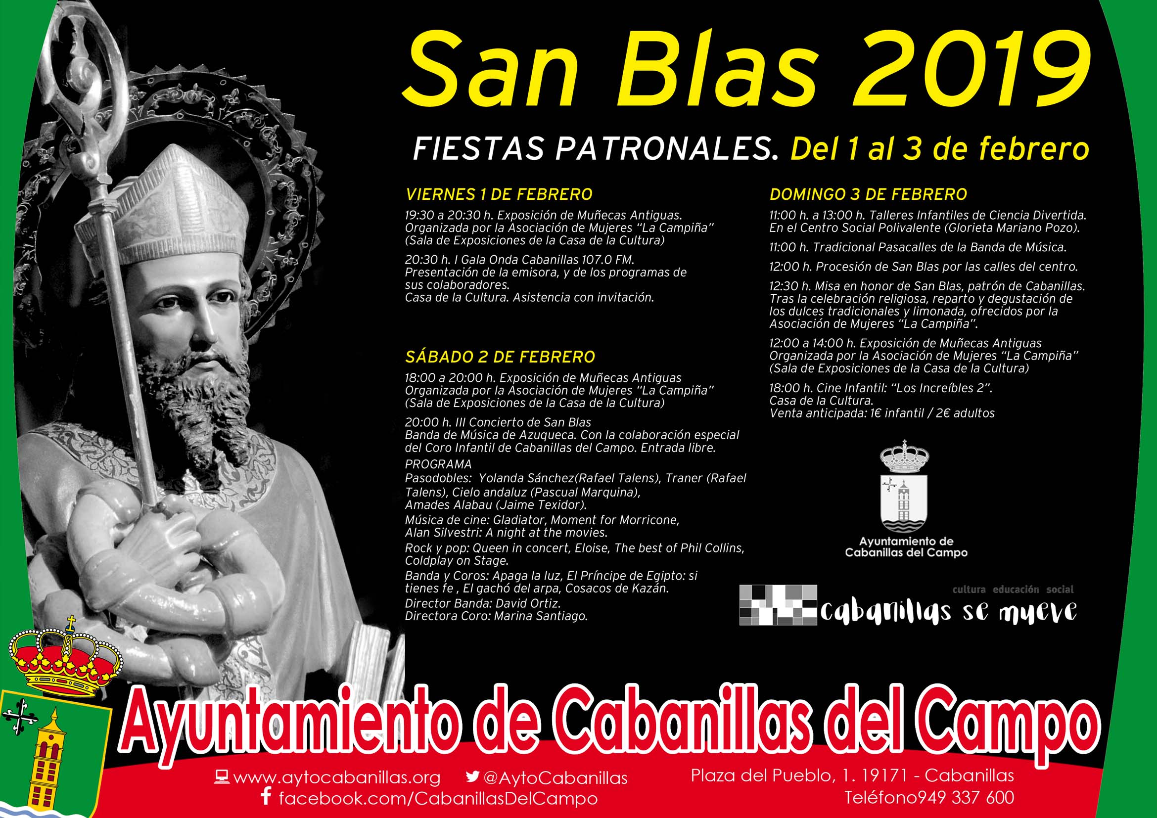 Ya está disponible para consulta y para descarga el Programa de las Fiestas de San Blas de este año 2019, que se celebrarán en Cabanillas del Campo del viernes 1 al domingo 3 de febrero. La Fiesta patronal de la localidad contempla este año la celebración de una decena de actos, entre las tradicionales celebraciones religiosas en honor al patrón, y varias propuestas lúdicas y culturales.